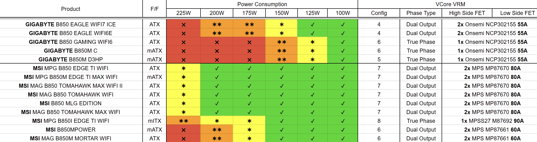 | GIGABYTE X870 GAMING WIFI6 | ATX | – | ** | ** | * | 4 | 2x Onsemi NCP302155 55A |